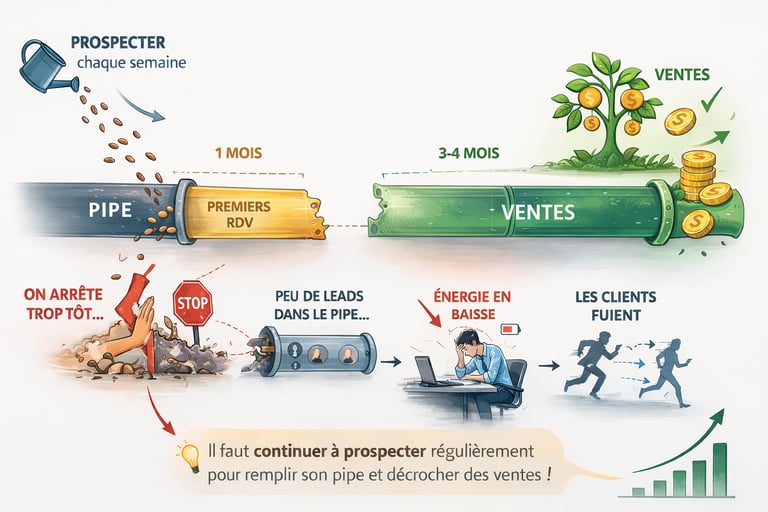 A chaque fois que je relançais un cycle de prospection, ça prenait au minimum 2 mois de prospection pour remplir le pipe, puis les clients commençaient à tomber tous en même temps à partir de ce moment-là (souvent au bout de 2 à 4 mois).