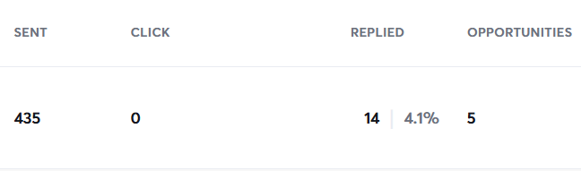 435 emails envoyés, 14 réponses, 5 opportunités. Soit une opportunité tous les 75 emails envoyés environ.