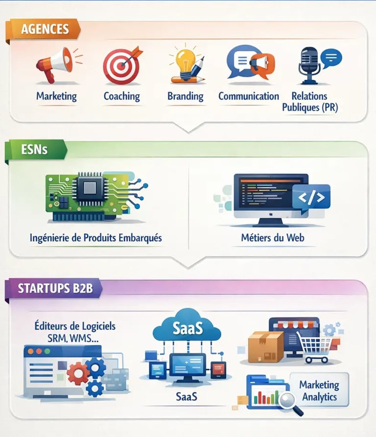 J’accompagne des startups, des éditeurs de logiciels SaaS, des agences, des ESNs, et des entreprises industrielles